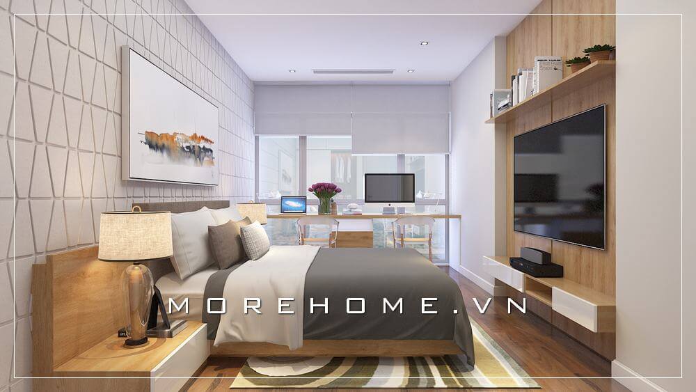 Thiết kế giường ngủ chung cư phong cách hiện đại, tinh tế, vách đầu giường ốp nỉ cùng màu tạo nên sự thanh thoát và mềm mại hơn