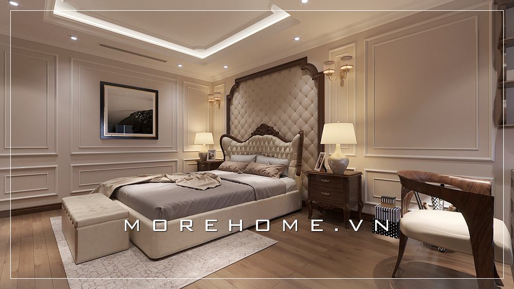Thiết kế giường ngủ chung cư cao cấp phong cách tân cổ điển sang trọng, tiện nghi