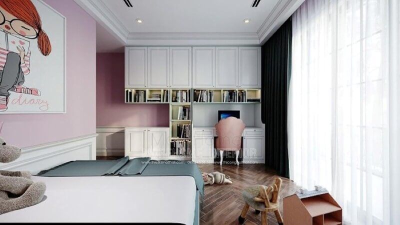 Góc học tập thiết kế tối giản mang lại vẻ đẹp ấn tượng cho phòng của con.