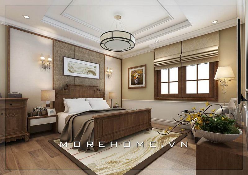Giường ngủ biệt thự được làm từ chất liệu gỗ tự nhiên nhập khẩu sang trọng, gam màu nâu trầm ấn tượng tạo sự thoải mái cũng như điểm nhấn hoàn hảo cho cả căn phòng