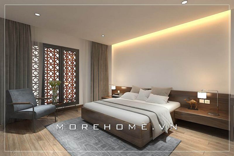 Giường ngủ gỗ công nghiệp màu nâu chủ đạo mang đến cảm giác ấm cúng và thoải mái hơn cho mỗi giấc ngủ
