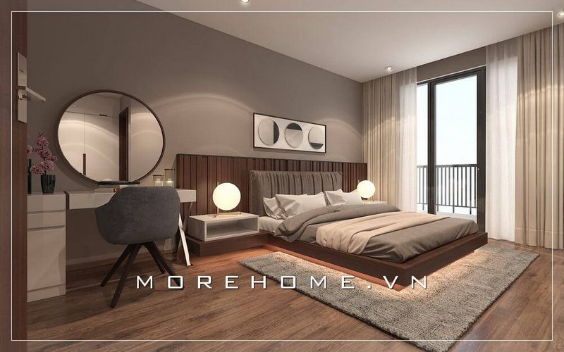 Giường ngủ bệt gỗ công nghiệp với màu nâu sang chảnh, thoải mái mà không kém phần tiện nghi
