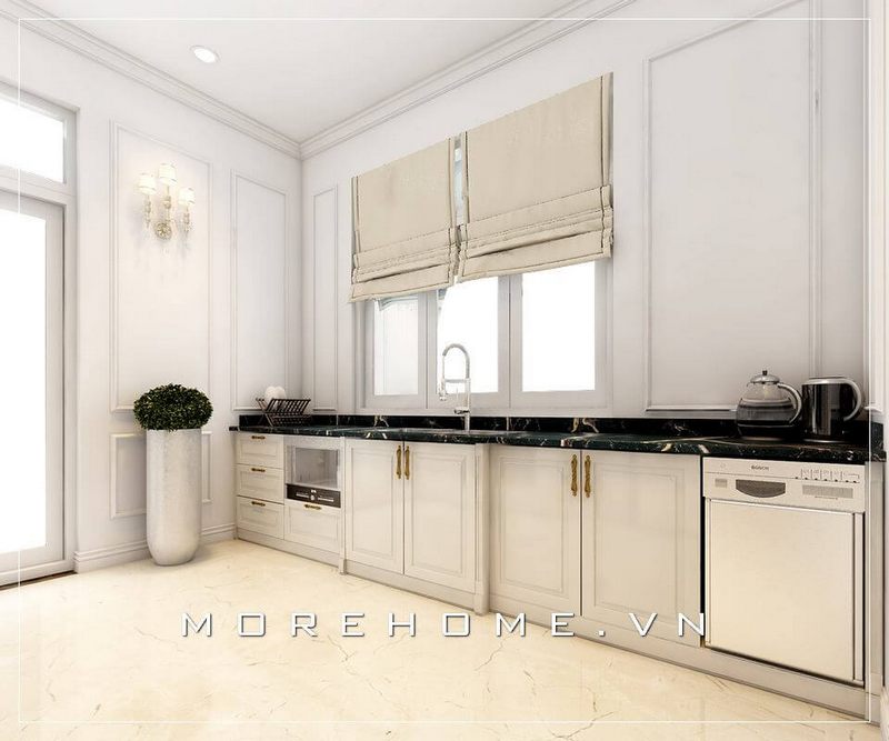 Mẫu tủ bếp gỗ tự nhiên màu trắng với thiết kế chữ i, mặt bếp ốp đá màu đen cao cấp mang đến sự hiện đại, gọn gàng và tiện nghi cho không gian phòng bếp