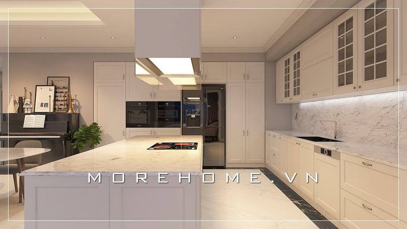 Mẫu tủ bếp gỗ hiện đại, mặt bếp ốp đá màu trắng vân mây tinh tế giúp không gian phòng bếp sạch sẽ và thoáng mát hơn