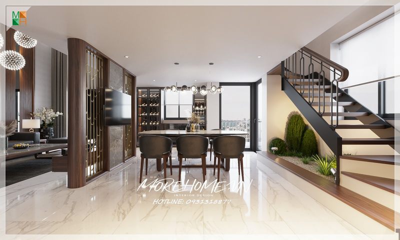 Bên cạnh đó, việc kết hợp các yếu tố tự nhiên như cây xanh vào thiết kế cũng đóng vai trò quan trọng. Không chỉ làm dịu mắt, cây cối còn giúp cải thiện chất lượng không khí, tạo ra một môi trường ăn uống thoải mái và dễ chịu. Hãy thử đặt một chậu cây nhỏ trên bàn hoặc treo những chậu cây dây leo gần cửa sổ để tạo điểm nhấn cho phòng ăn của bạn. Sự kết hợp hoàn hảo giữa vật liệu hiện đại và thiên nhiên sẽ mang lại một không gian vừa tinh tế vừa gần gũi, khơi gợi cảm hứng cho mỗi bữa ăn.